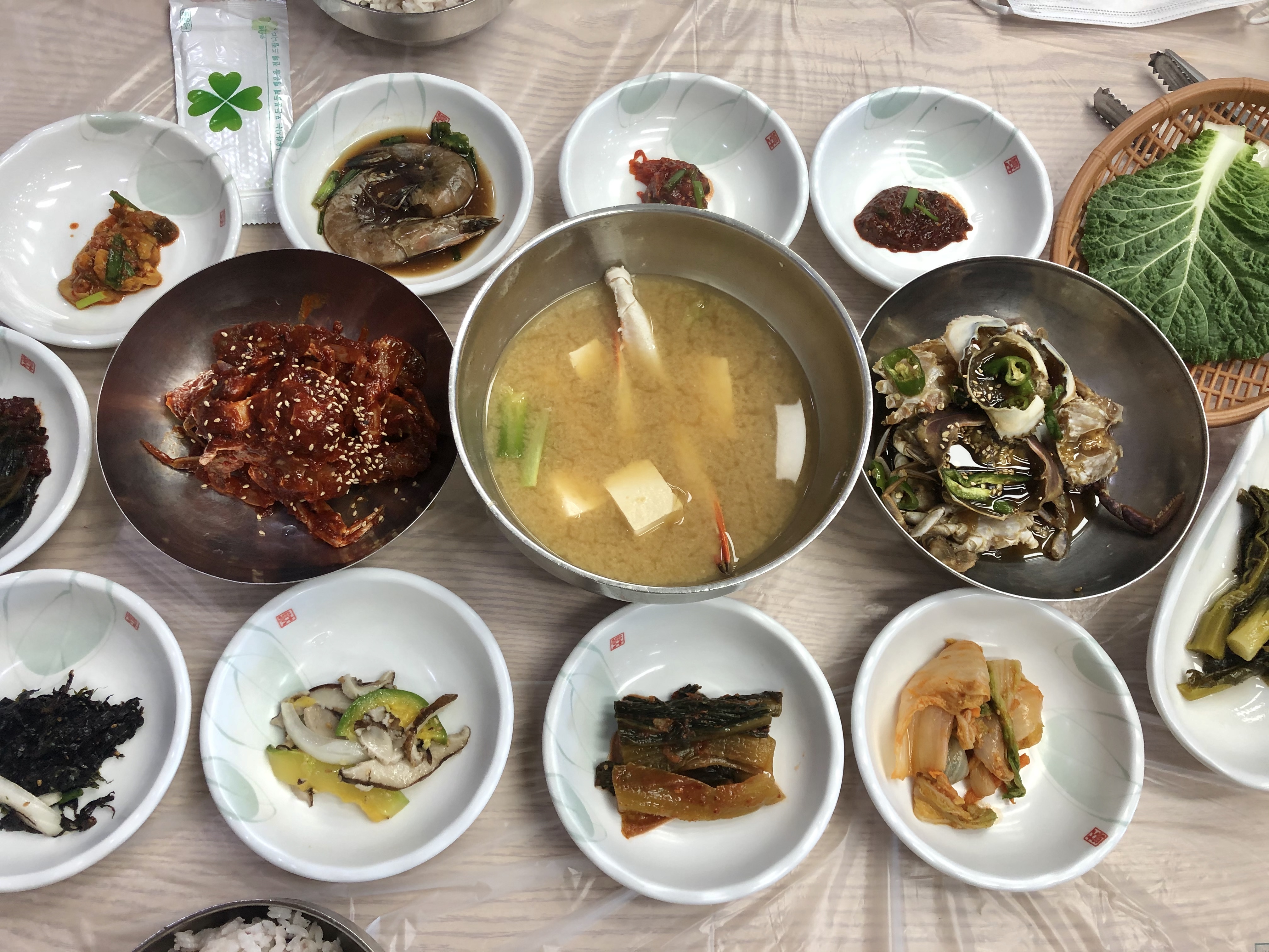 김무친, 애호박버섯무침, 갓김치, 여러 나물과 젓갈류, 꽃게된장국, 쌈류