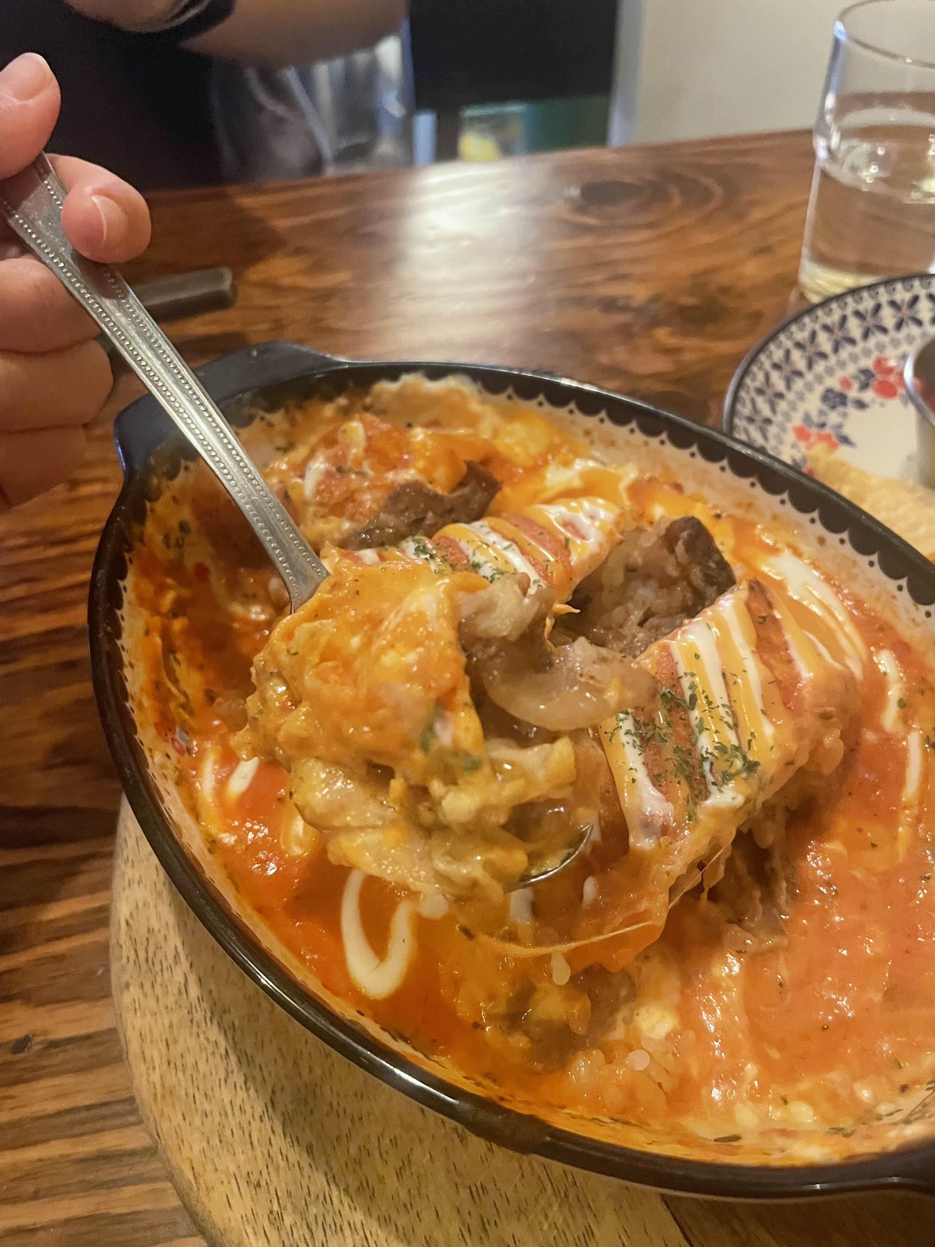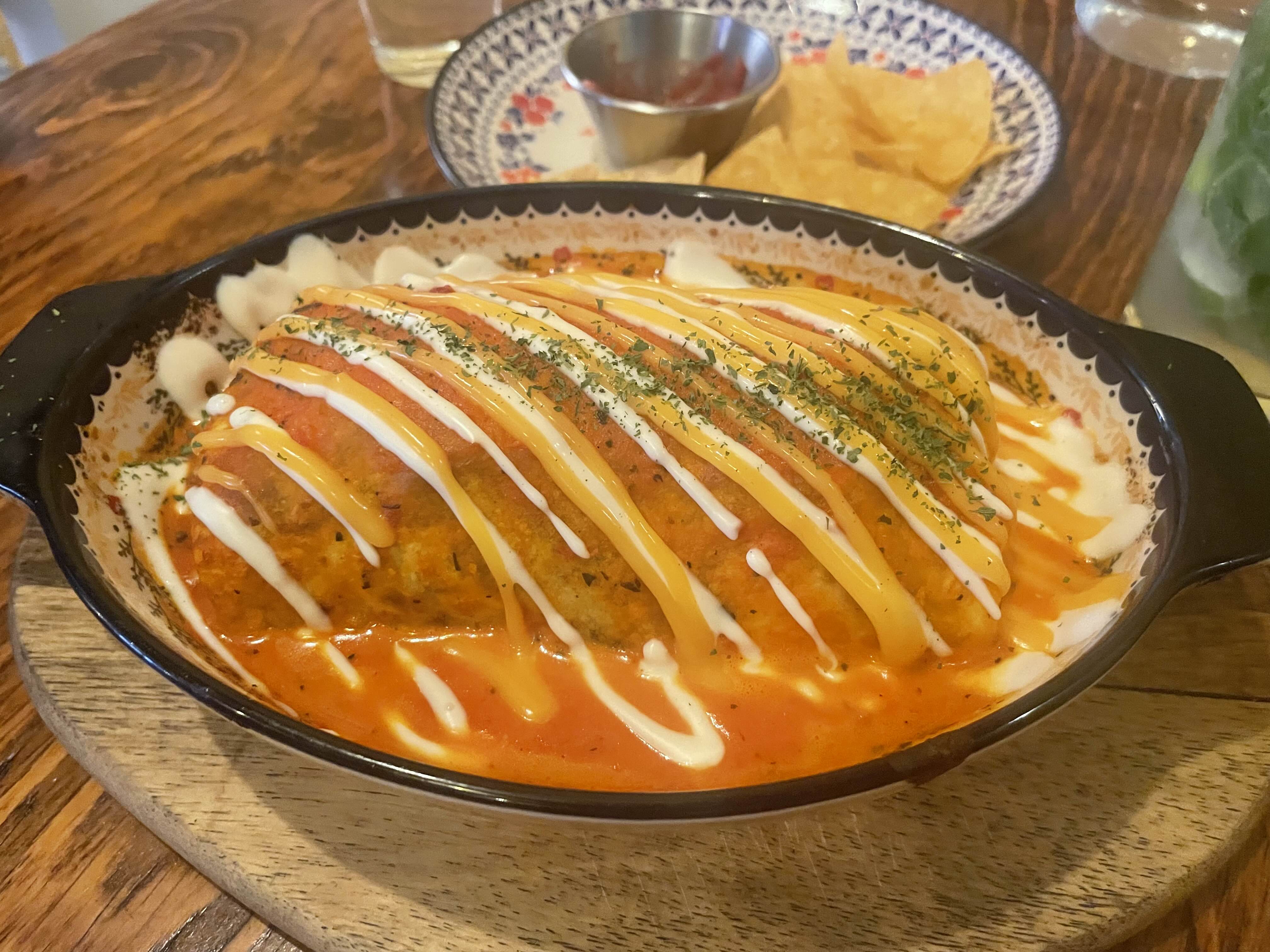 제육볶음, 콩, 밥, 치즈와 매콤한 로제소스가 들어간 버뮤다삼각지의 대표메뉴. 매콤 엔칠라다.