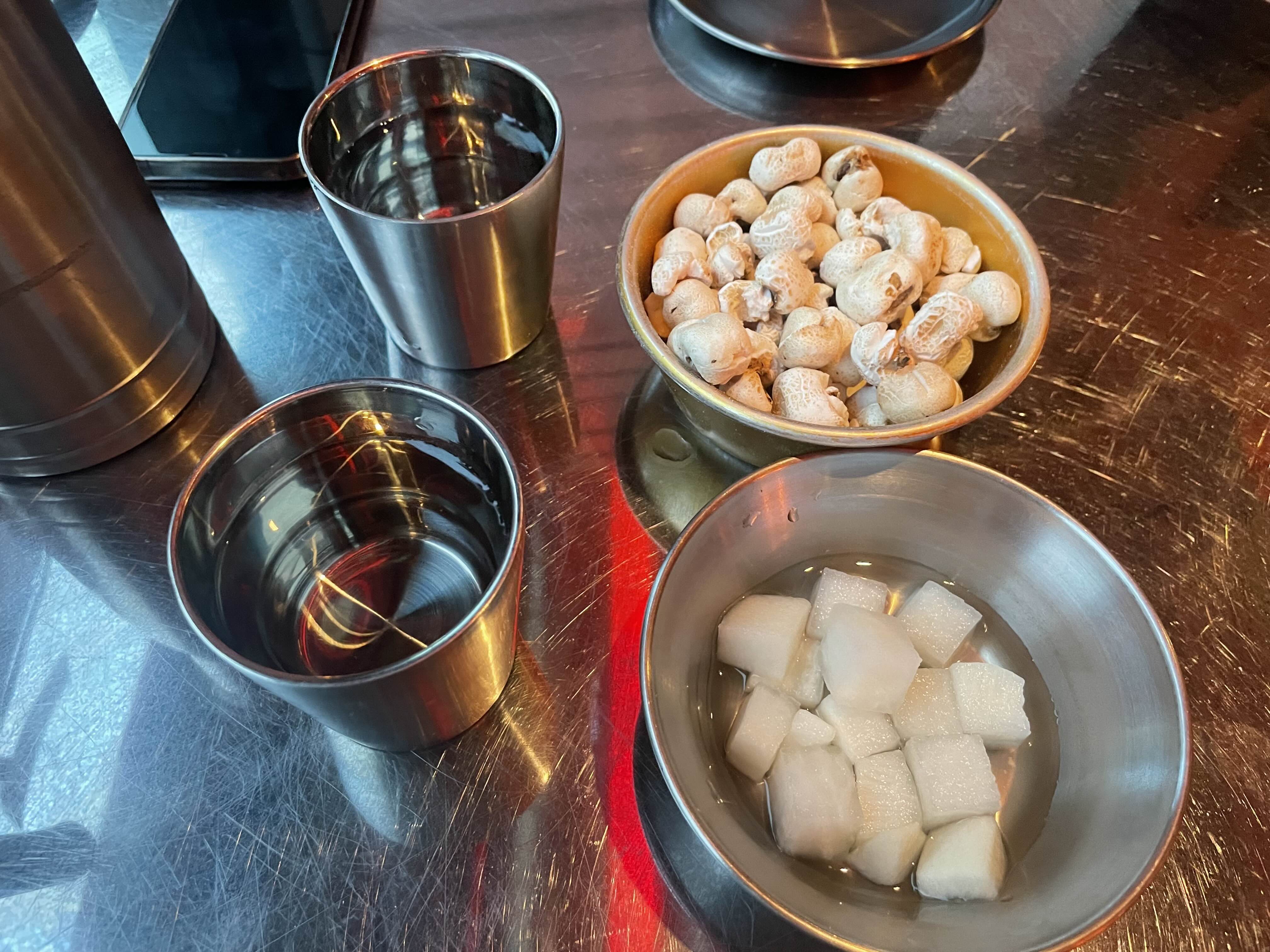 기본 안주는 강냉이와 치킨무가 나와요.