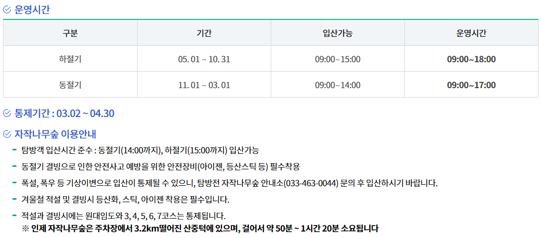 왕복 3시간정도 걸리기에 하절기는 15시까지, 동절기엔 14시까지 입산 가능합니다!