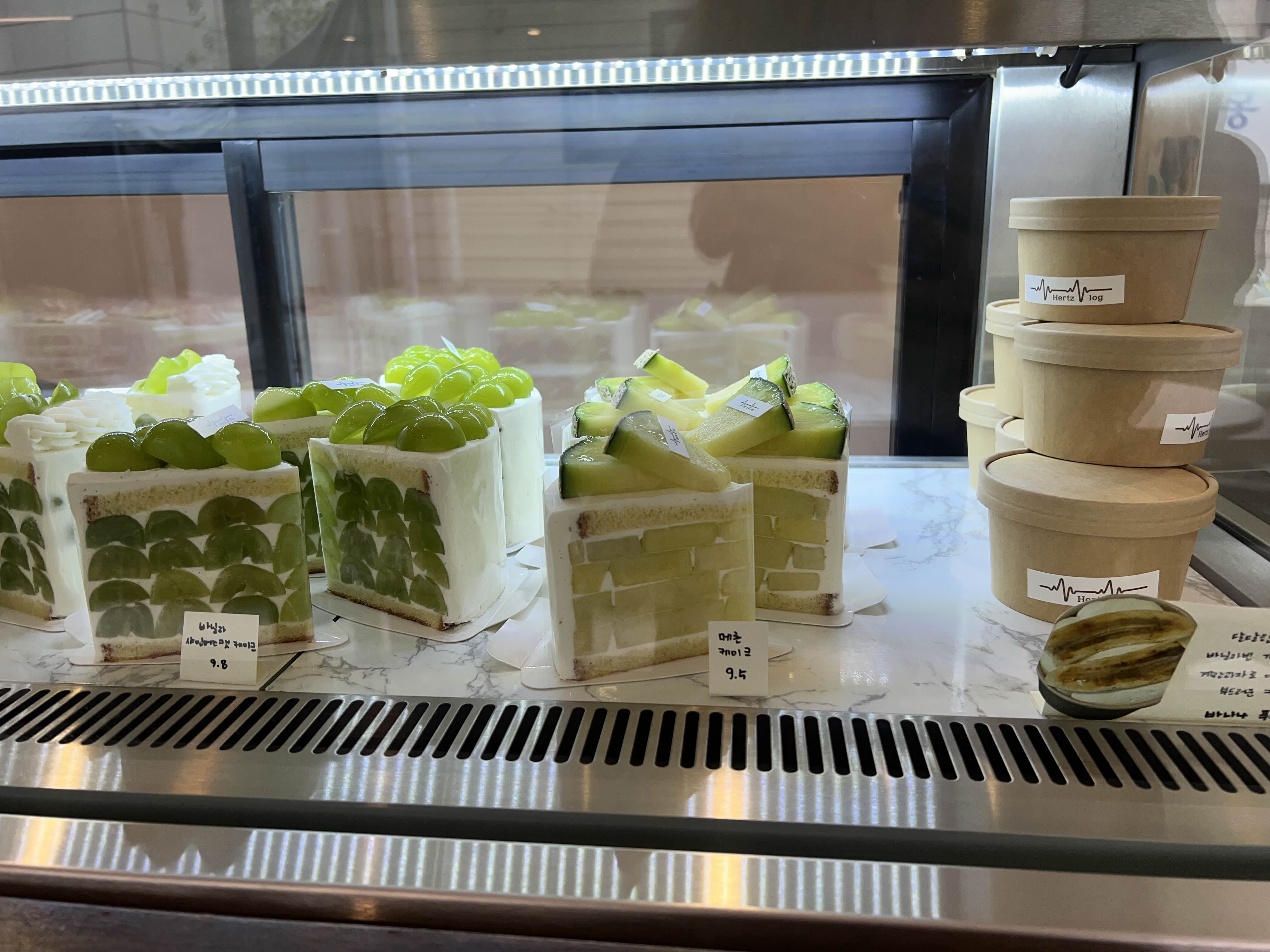 쇼케이스에 다양한 케이크와 구움과자가 가득했어요>_<