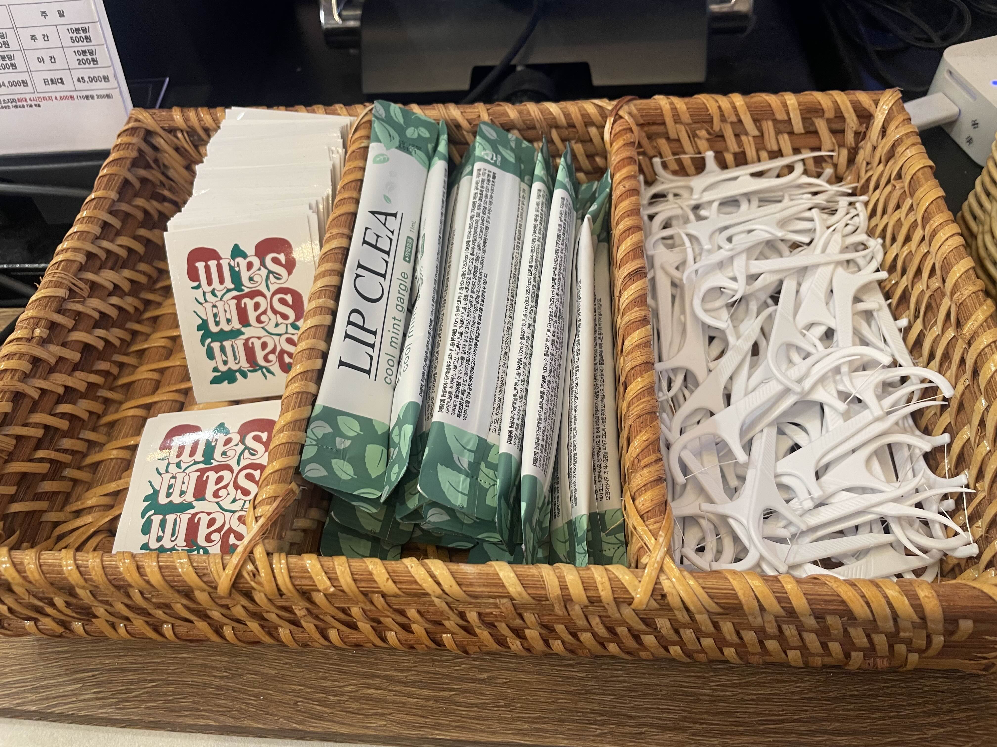 계산하고 나갈때 준비되어있는 일회용 가글액과 치실!!! 치위생용품 러버로써, 이런 세세한 용품들을 준비해줬다는거에 대해 감동이었어요ㅎㅎㅎ