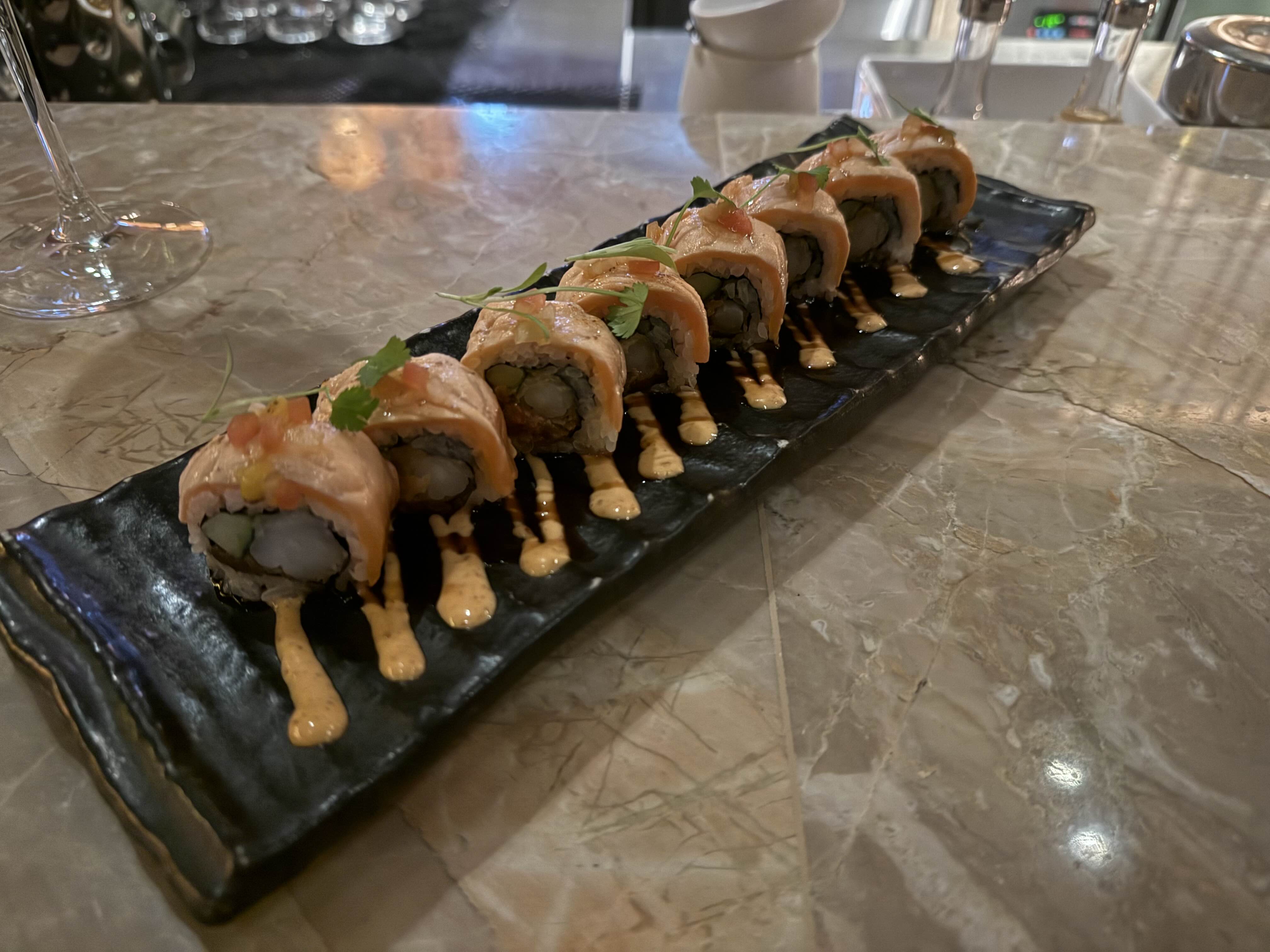 새우, 연어, 치폴레 소스가 들어간 롤이에요.